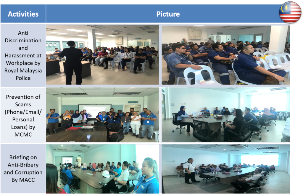 Various compliance related activities such as talks, case studies, group activities, week quizzes were held at each OMS locations to enhance understanding of compliance in the daily work context. For our Brunei and Malaysia facility, they invited their respective Anti-Corruption Authorities to give talks on anti-corruption at their premises. Both Indonesia and Saudi Arabia organized their own internal seminars on anti-corruption for the people.